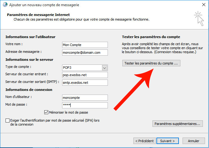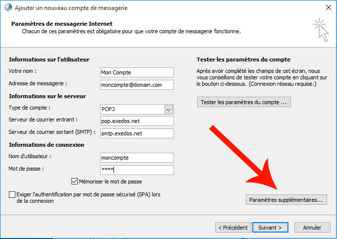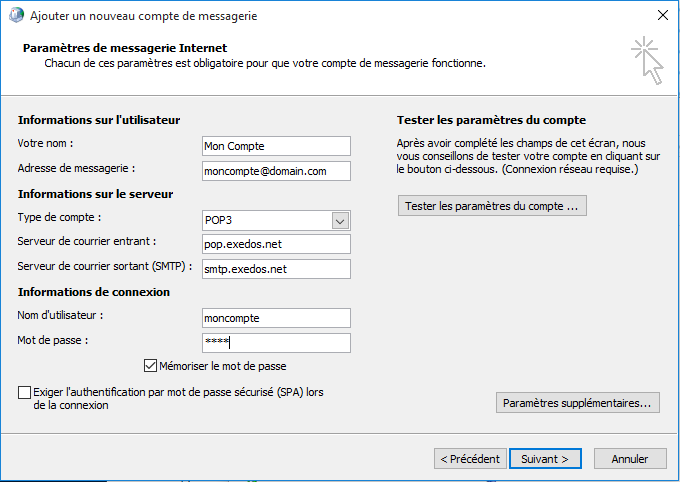 - Serveur de courrier sortant(SMTP) : smtp.exedos.net