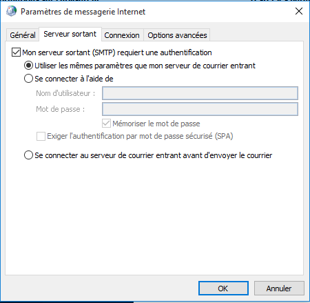 Cliquez sur l'onglet “Serveur sortant” et cocher “Mon serveur sortant(SMTP) requiert une authentification”