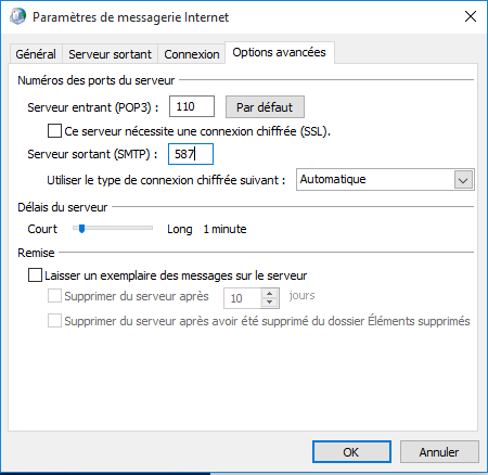 - Serveur sortant (SMTP) : 587 (Utiliser le type de connexion (Automatique))