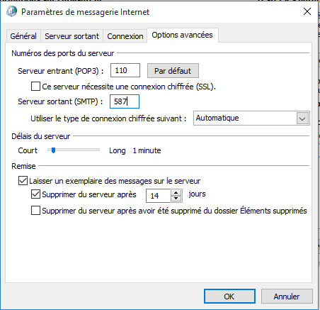 - Serveur sortant (SMTP) : 587 (Utiliser le type de connexion (Automatique))