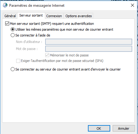 Cliquez sur l'onglet “Serveur sortant” et cocher “Mon serveur sortant(SMTP) requiert une authentification”