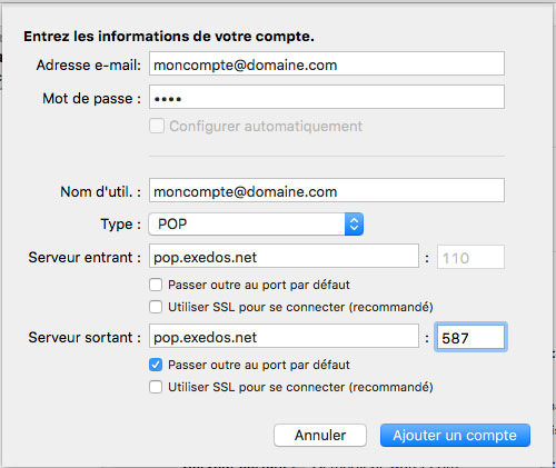 - Serveur de courrier sortant(SMTP) : smtp.exedos.net