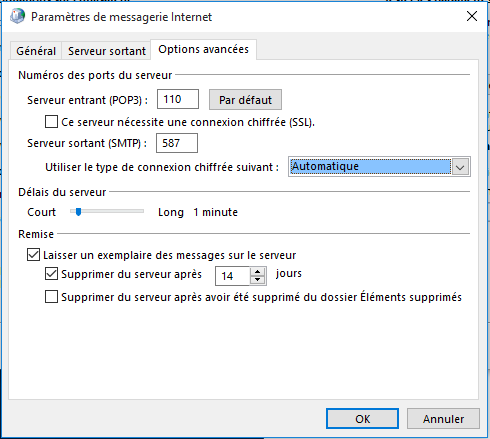 - Serveur sortant (SMTP) : 587 (Utiliser le type de connexion (Automatique))