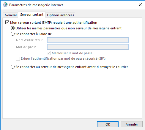 - Cliquez sur l'onglet “Serveur sortant” et cocher “Mon serveur sortant(SMTP) requiert une authentification”